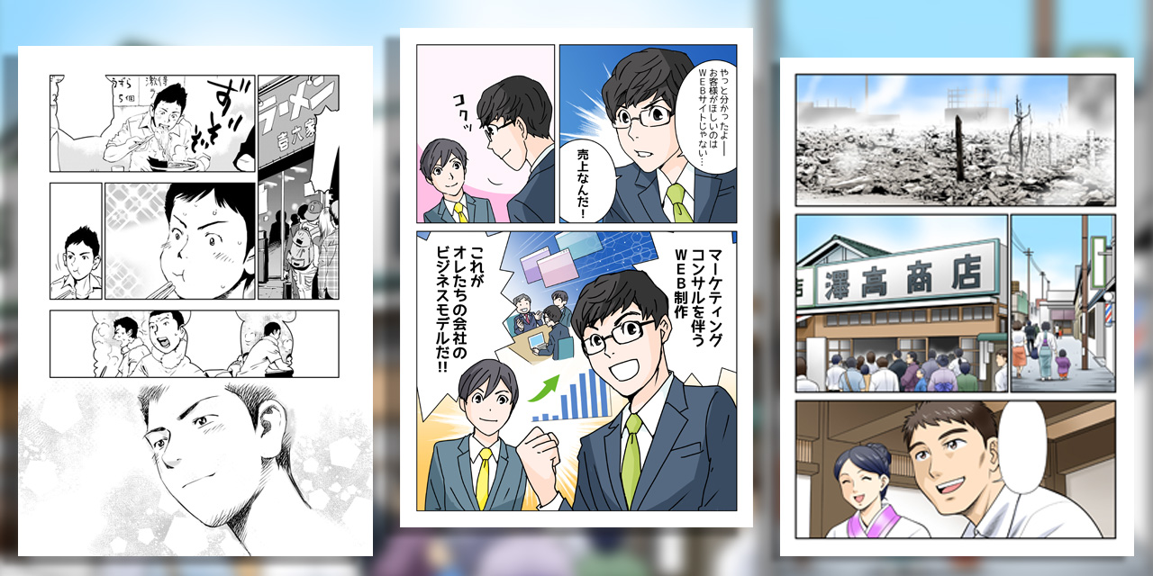 漫画を使った社史の場合には、一冊を通じて創業者を主人公にしても良いですし、エピソードごとに主人公を変えても構いませんが、必ずキャラクター(主人公)が必要です。主人公の視点で、会社の歴史やエピソードを擬似体験していきます。感情を揺さぶられることで、読み手は「おもしろく」「読みやすく」「伝わる」ことができます。フィクションによる脚色があったとしても、脚注で補足することができるのでエンタメ化しやすいのが特徴です。その他、詳しい説明はこちらをご参照ください。
